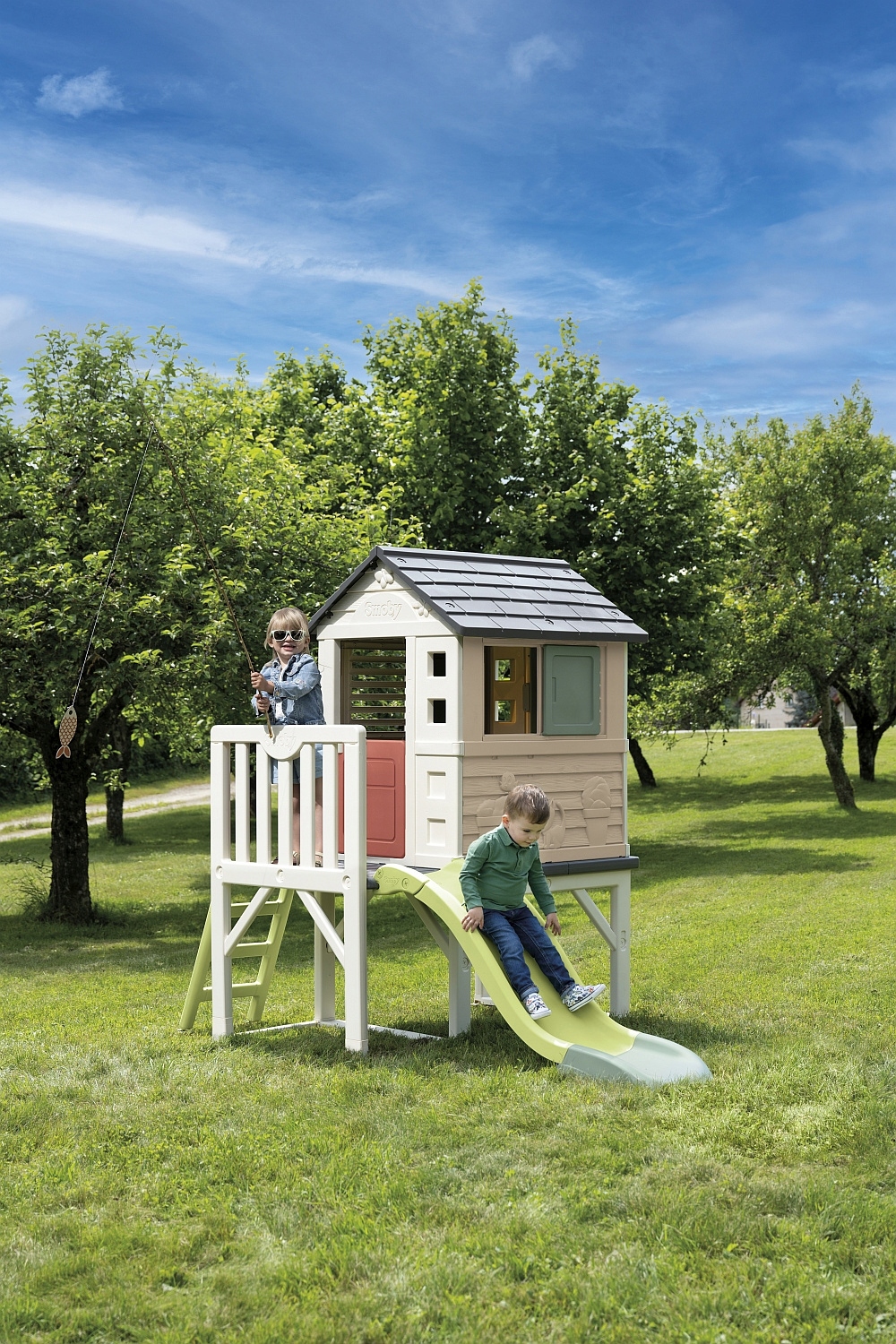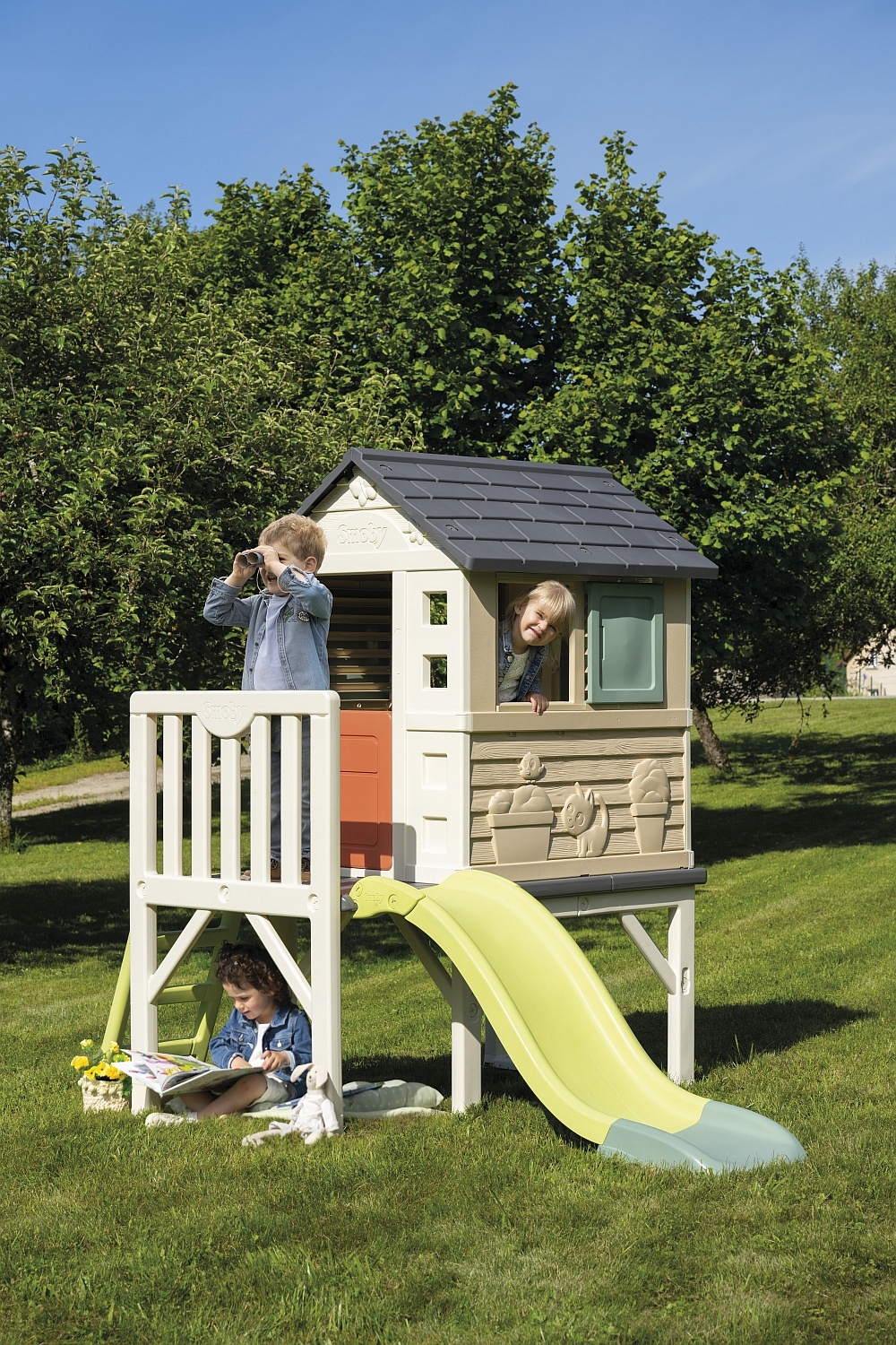 Dzięki umieszczeniu domku na palach, zabawa we wchodzenie do góry i zjazd na ślizgawce nie ma końca!