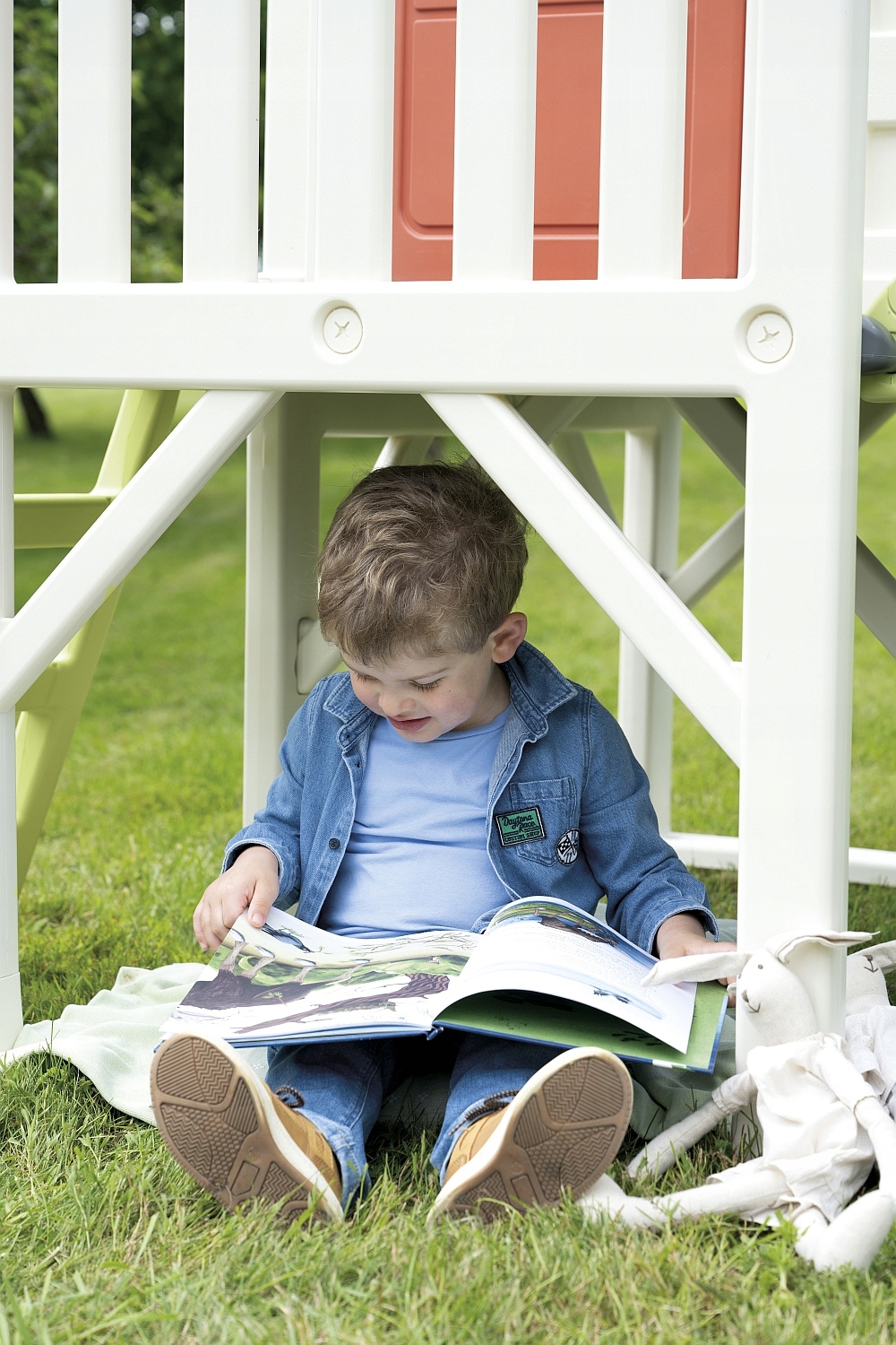 Tworzywo, z którego wykonano domek jest całkowicie odporne na działanie czynników atmosferycznych i pokryte powłoką anty UV zapewniającą trwałość kolorów i zapobiegającą ich blaknięciu na słońcu. To całkowicie bezpieczna zabawka, nadająca się do użytku tak na zewnątrz (ogród, działka itd.) jak i w domowym wnętrzu.