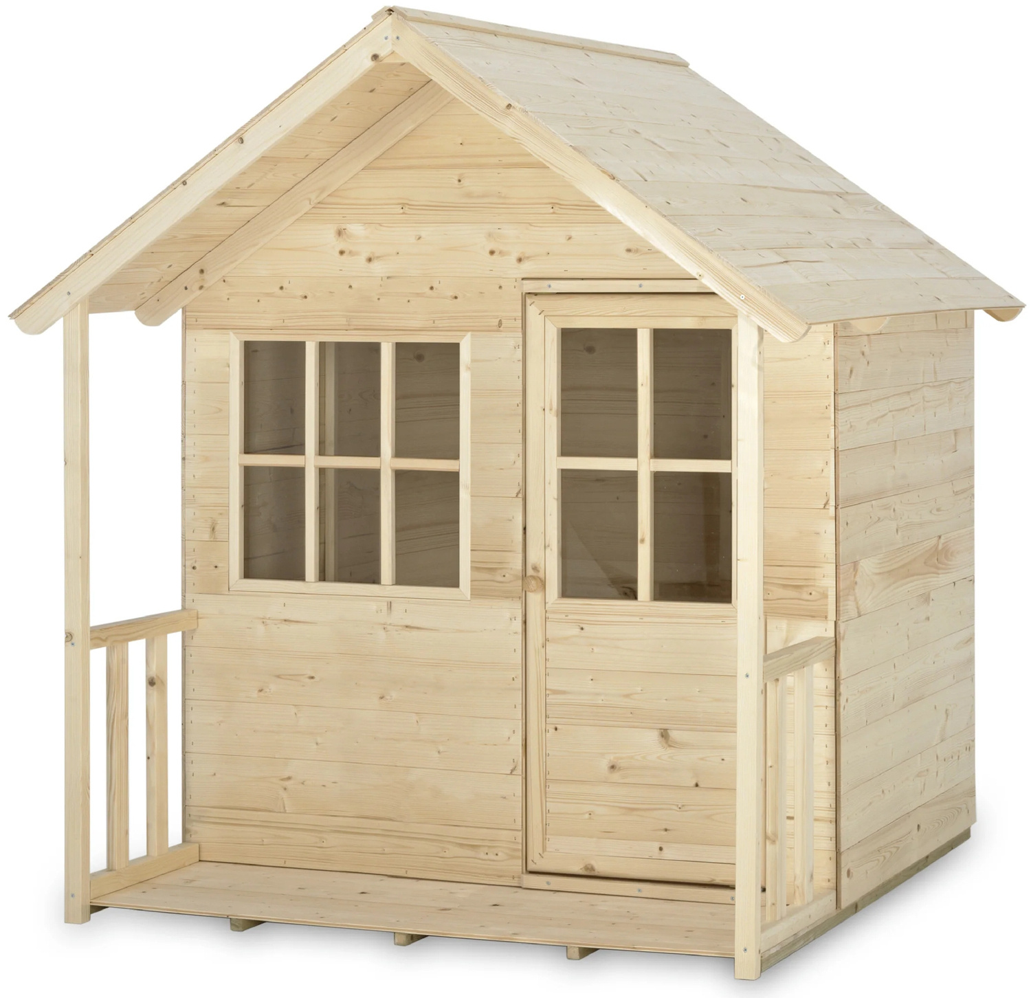 Ten uroczy, przestronny, drewniany domek z werandą dla dzieci stanie się ulubionym miejscem do zabawy i spędzania czasu na świeżym powietrzu. Domek został wykonany z naturalnego, certyfikowanego drewna FSC, co nadaje mu rustykalny i przytulny wygląd. Domek jest bezpieczny, widny i wygodny, a podłoga została wyłożona wytrzymałymi deskami. Dzięki temu dzieci będą miały duże i komfortowe miejsce do zabawy.