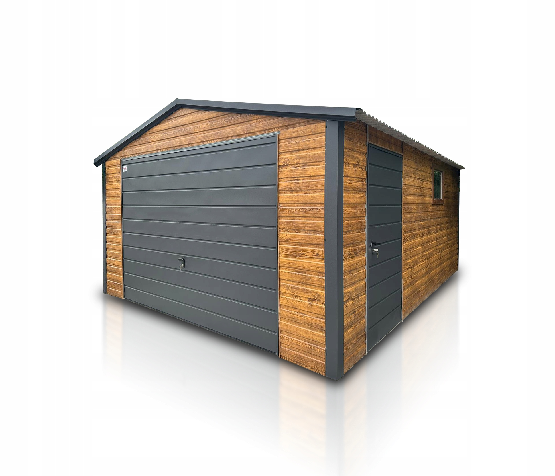 Garaż blaszany 4×6 drewnopodobny złoty dąb + grafit filc obróbki