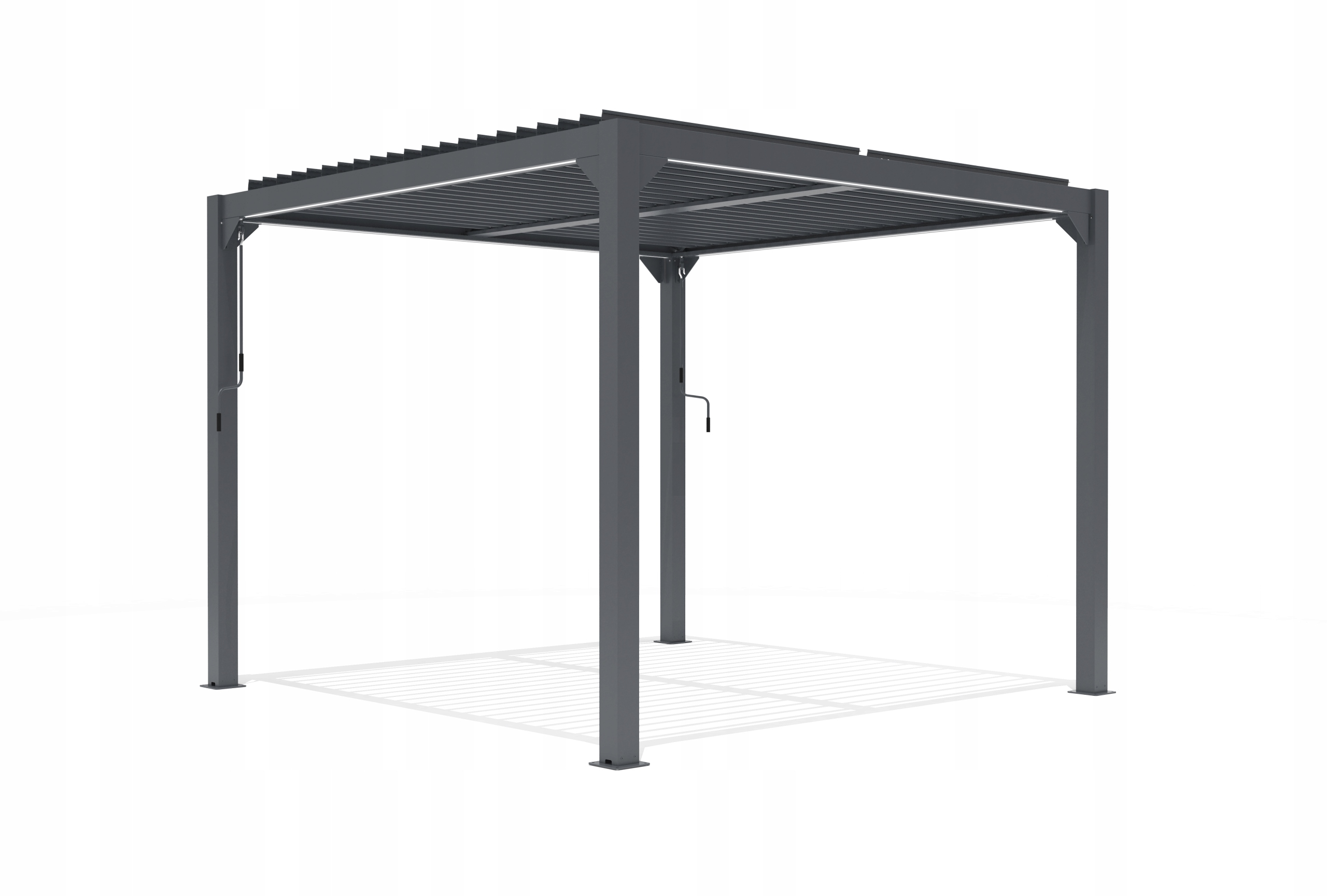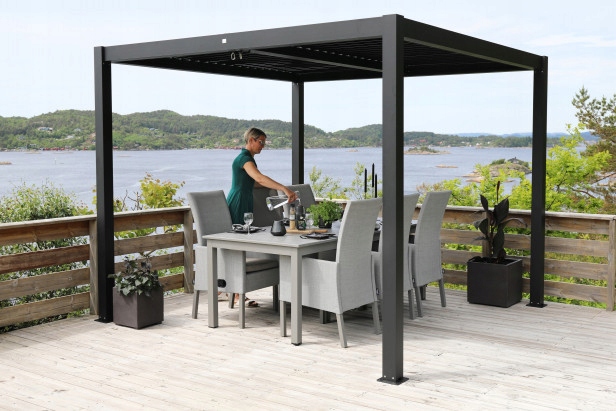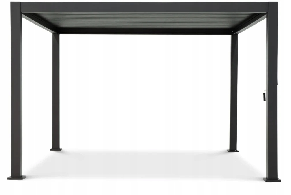 Główną zaletą pergoli jest dach z ruchomymi aluminiowymi lamelami. Dach ma kilka funkcji – w gorące letnie dni, przy odpowiednim ustawieniu lamel, zapobiega bezpośredniemu promieniowaniu słonecznemu, a jednocześnie wentyluje przestrzeń pod pergolą, dzięki czemu spędzisz gorące letnie dni w przyjemnym cieniu. W czasie deszczu, gdy lamele są ustawione w pozycji poziomej tworzą one wodoszczelny dach. Pergola posiada system odprowadzenia wody opadowej z otworami odpływowymi ukrytymi w słupach nośnych.