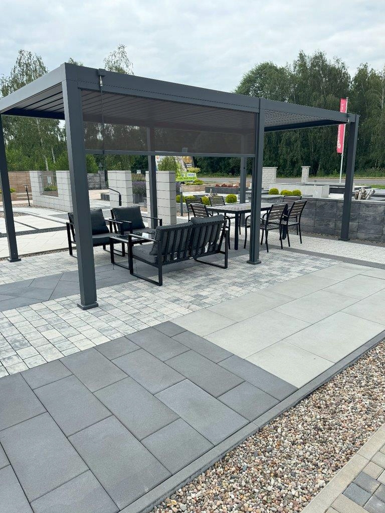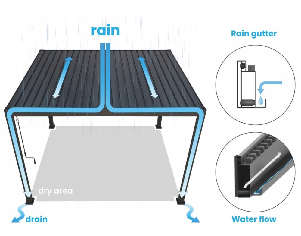 - Specjalnie zaprojektowany system odprowadzania wody rynnami do nóg pergoli